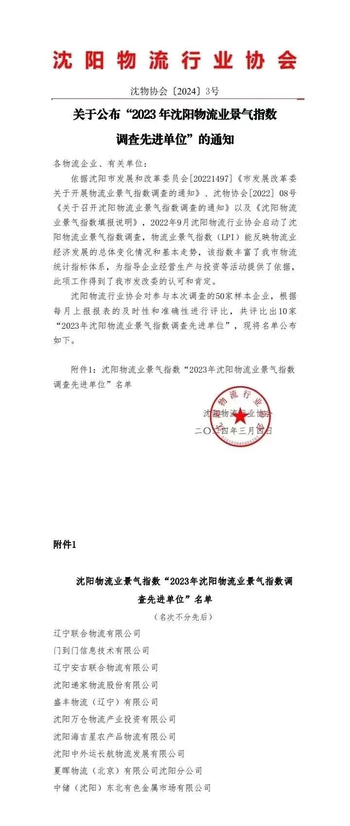2022年9月,沈阳物流行业协会启动了沈阳物流业景气指数调查。物流景气指数(LPI)能反应地 物流业经济发展的总体变化情况和基本走势,丰富了我市物流统计指标体系,为指导企业经营生产与投资等活动提供依据。作为沈阳市物流行业协会的会员单位,公司一直积极参与,按期准确填报数据,及时与协会沟通与反馈,参与地方物流行业建设,助力地方物流行业健康发展。